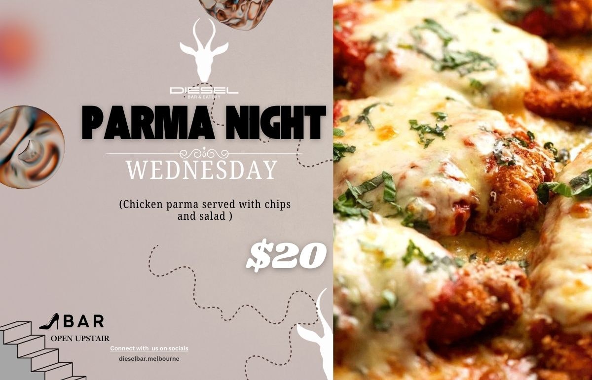 Parma Night Every Wednesday for $20 only Home ... Offers Parma Night Every Wednesday for $20 only Get a chicken parma with side of chips for $20 only. Terms and Conditions apply. See in store for more details. Details Valid until: 31 Dec 2026 Diesel Bar , Located on G 03 9663 8078 Other offers from Diesel Bar $21 For Porter House all night Unlimited $21 for steak every Tuesday NA