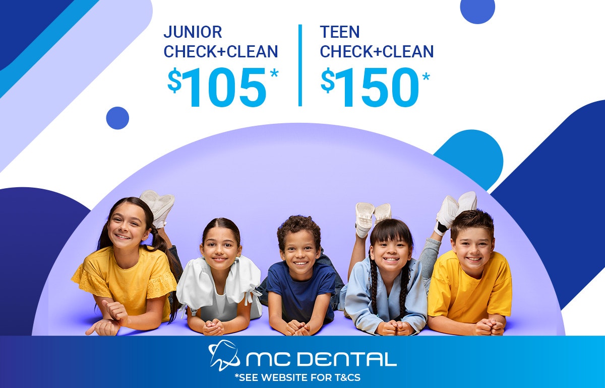 Book online and select “$105 Junior Check+Clean” or “$150 Teen Check+Clean” from the drop-down menu. Or phone your nearest MC Dental clinic and our friendly team will help you book the Junior or Teen Check+Clean appointment. Available with participating dentists.